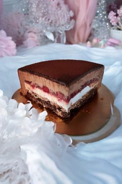 La Cofetaria Creativă Ana’s, Paradoxul de ciocolată cu zmeură este o provocare delicioasă pentru simțuri. Un blat umed cu ciocolată, intens și misterios, ascunde sub glazura sa oglindă un crocant Pailleté Feuilletine, ce te surprinde cu textura sa fină. O crema fină de ciocolată albă, asemenea unui nor pufos, se împletește armonios cu jeleul vibrant de zmeură, o explozie de gusturi și culori. Apoi, mousse-ul decadent de ciocolată neagră și ciocolată cu lapte te învăluie într-o îmbrățișare catifelată, completând perfect această experiență paradoxală. O adevărată operă de artă a gustului, ce te va cuceri cu fiecare strat.